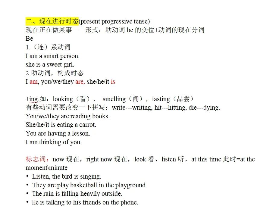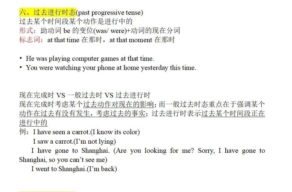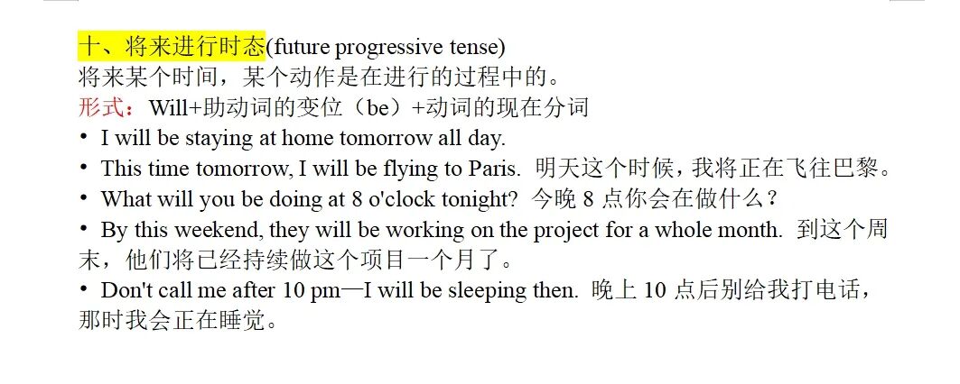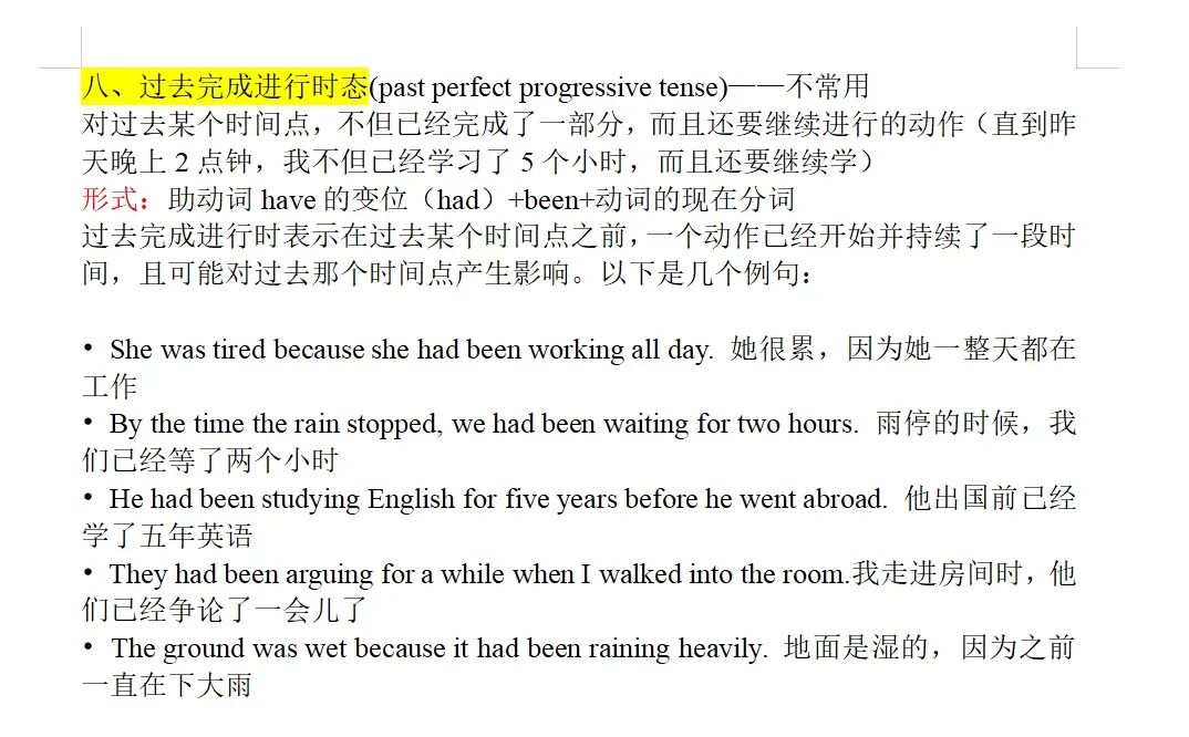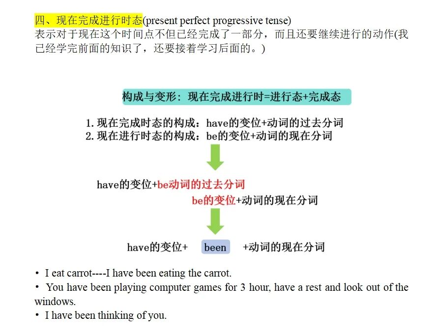 ●完成进行时态:例如:他从昨天晚上就开始复习数学,现在还没停呢。(他已经复习了一段时间数学了,但是还没停。)