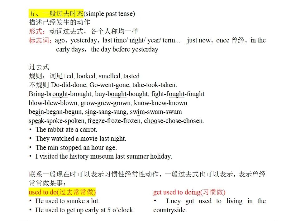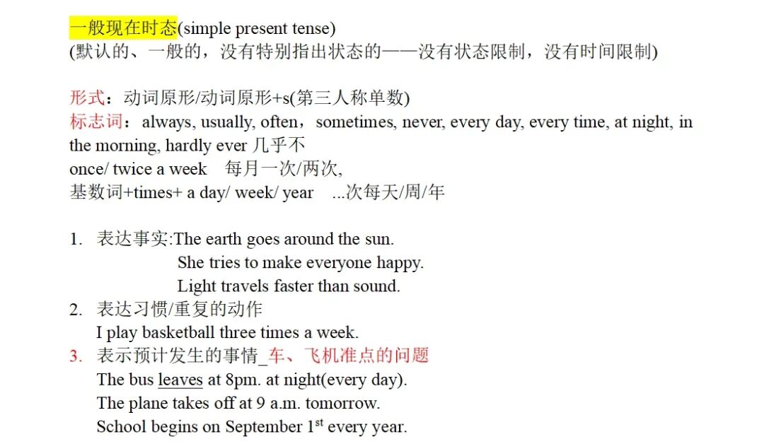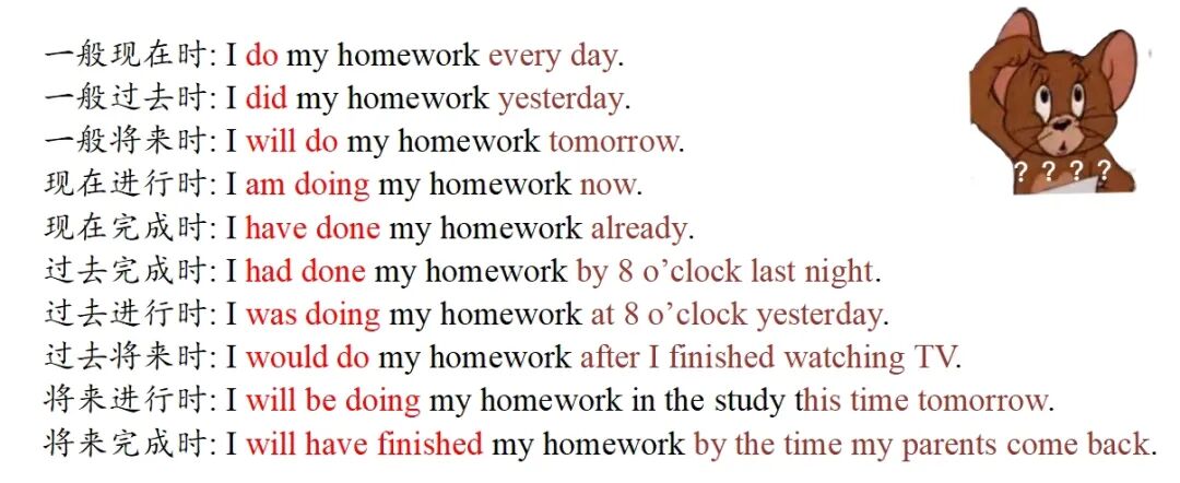 可以发现,这些句子不同的地方就是谓语动词(红色)和时间状语(紫色),因此一句话来概括: