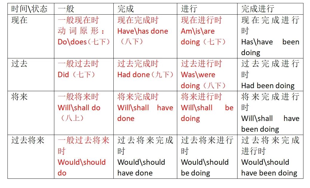 理论上有共有16种动词时态=4种时间(现在、过去、将来、过去将来)×4种状态(一般、完成、进行、完成进行)