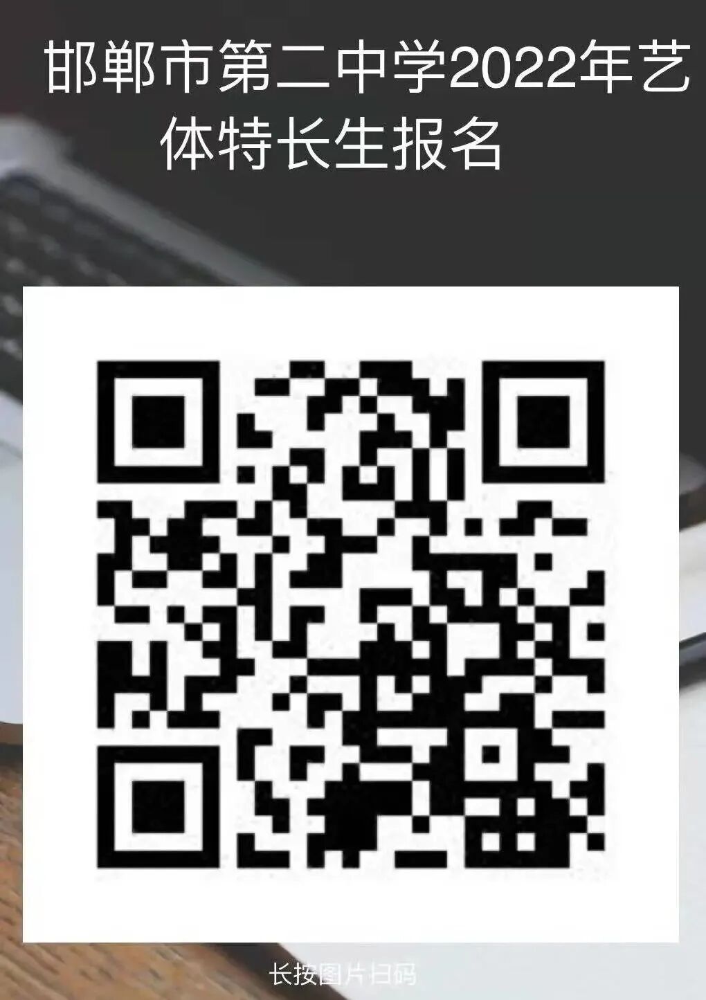 扫描或识别此二维码,邯郸市第二中学2022年艺体特长生报名。打开页面根据要求填写相关信息后提交即可。(上传照片为标准证件照,红底蓝底均可。)