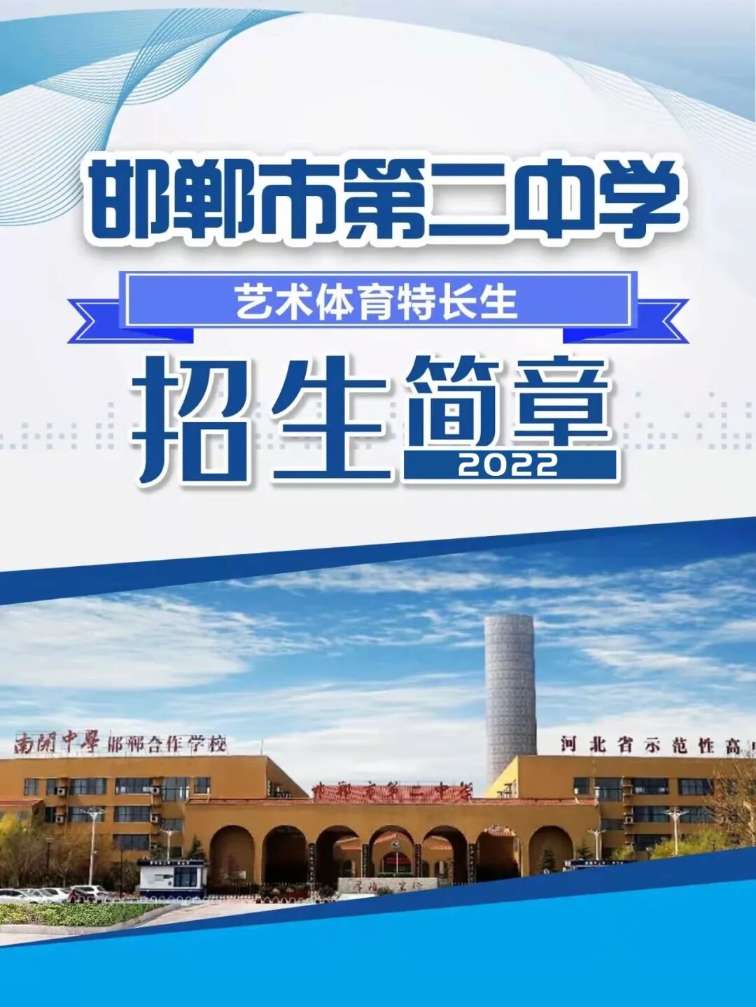 邯郸市第二中学,河北省首批命名的省级重点中学,立校60余年来,全面贯彻落实党的教育方针,始终秉承“厚植笃行”的校训精神,“用爱心和责任成就每一名师生”的办学理念,充分发挥雄厚师资力量、特色人才培养模式、学科综合优势,致力于培养德智体美劳全面发展的社会主义建设者和接班人,为全国知名高等院校输送了大批优秀学子。为实现学生成长、国家选材、五育并举均衡发展,邯郸市第二中学现面向全市招收2022届初三年级应届艺体特长生,欢迎有志向、有兴趣、有专业素养的学子报名!