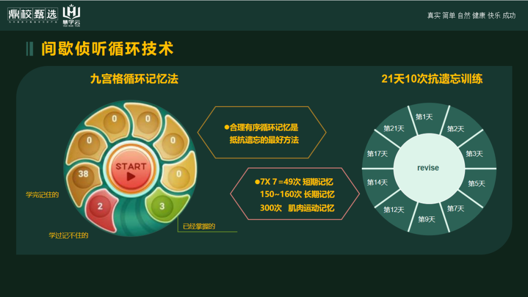 通过九宫格循环记忆法,每复习一次,记忆前移一格,七次巩固后达绿格,标志长期记忆建立。遗忘则回红格重启,再经七遍强化,直至重返绿格。结合课堂陪练、21天抗遗忘复习、九宫格达标及阶段通练,确保单词开口超300次,实现从短期到长期、永久记忆的跃迁,形成肌肉记忆。