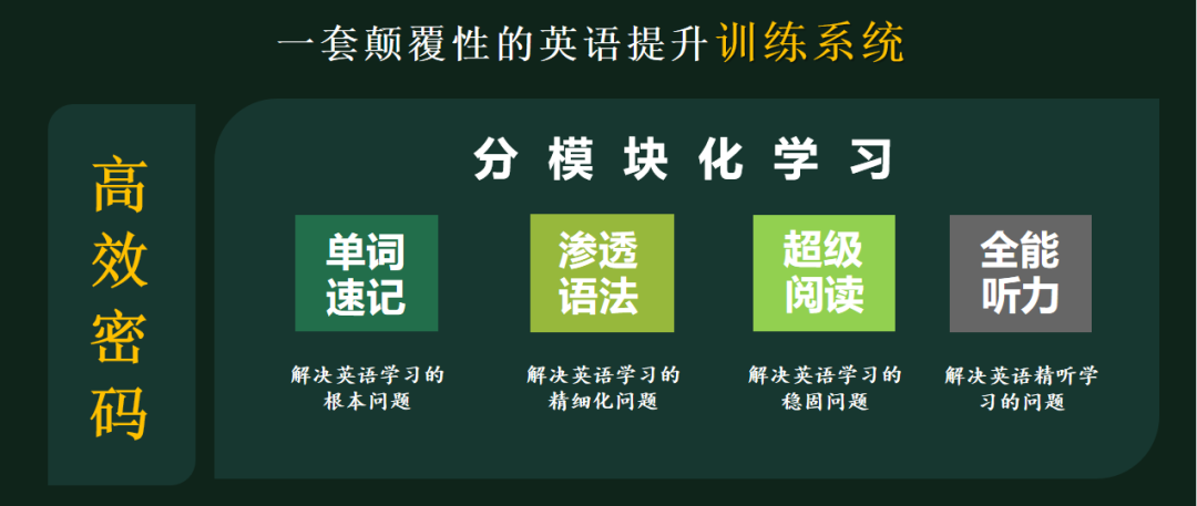 总体来讲,通过分模块学习,高效快速的提升用户语言能力(和结果)。尤其对于小高、初高中用户,是最快捷高效的方式。