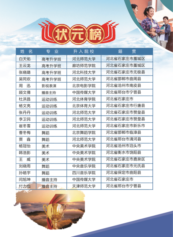 3、升学始终坚持以提升教育教学质量为中心,以构建高效课堂为重点,培养学生具备较高的文化水平及较好职业道德,以优异的成绩升入自己理想的本、专科院校继续深造,圆学生梦寐以求的大学梦。