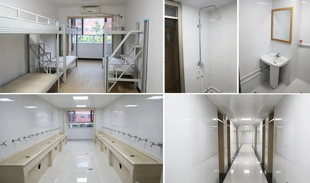 学生公寓:六栋学生公寓,以集中管理为原则,以年级为单位整齐排列入住。标准宿舍八人一间(四组上下铺),带卫生间、阳台、木柜、小桌、电扇、空调、暖气,电话。
