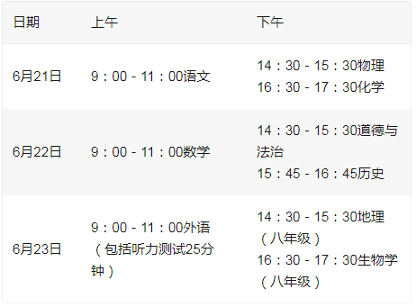 按照“学完即考”原则,地理和生物学笔试、生物学实验操作技能考试、信息科技考试安排在八年级,其他科目于初三统一安排。