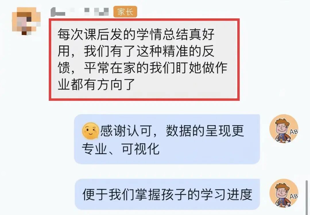 学情透明,每周可见:每次课后生成《AI学情报告》 ,具体呈现:掌握了哪几个知识点、在哪个环节有突破、下一步建议是什么。