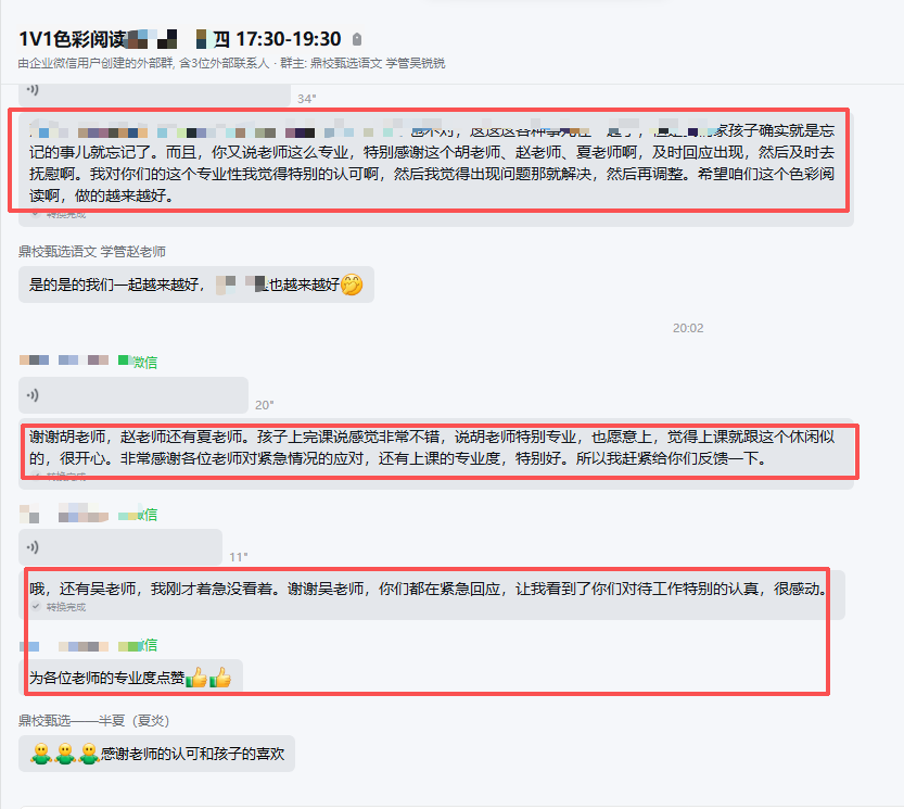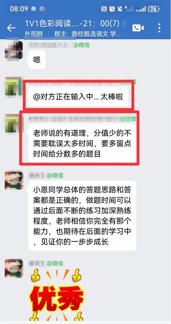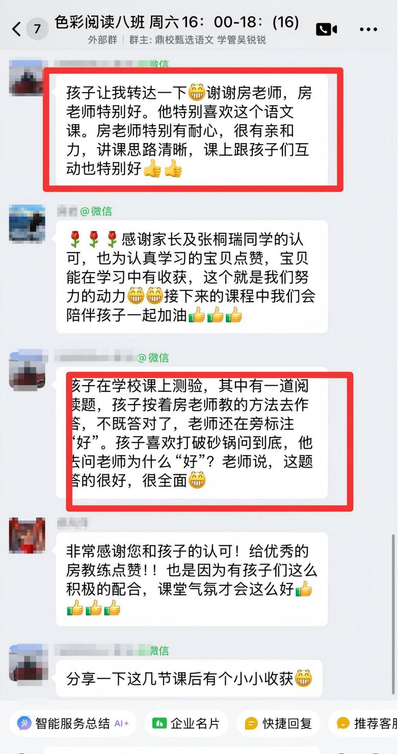 孩子性格内向,遇到不懂的不敢问,老师会主动引导,慢慢帮孩子建立信心,不仅教阅读方法,还给予足够的情绪价值,看着孩子越来越自信,真的太欣慰了!