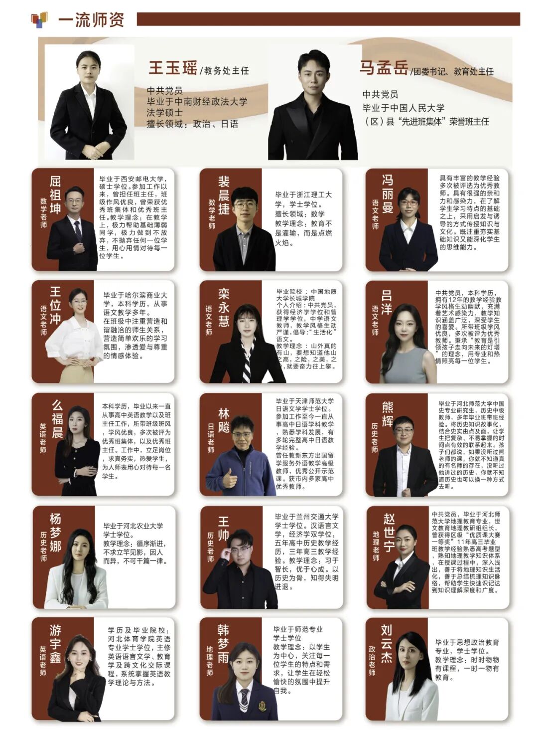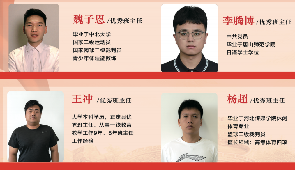 曾被评为 “衡水市优秀班主任”“优秀中层管理干部”“高考功勋教师”“卓越班主任”“优秀教师” 等。曾任酒泉博睿思中学执行校长,现任衡水卓恒教育集团校 —— 石家庄新艺中学执行副校长。2013 年大学毕业至今,从事历史教师工作十余年,身处教学一线,成绩优异,所教学生多人被香港大学、C9 院校录取;历经班主任、年级主任、教务主任、教学校长等岗位,管理经验丰富,促进学生实现 “低进优出,优进高出” 的转变,得到领导和同仁的认可。
