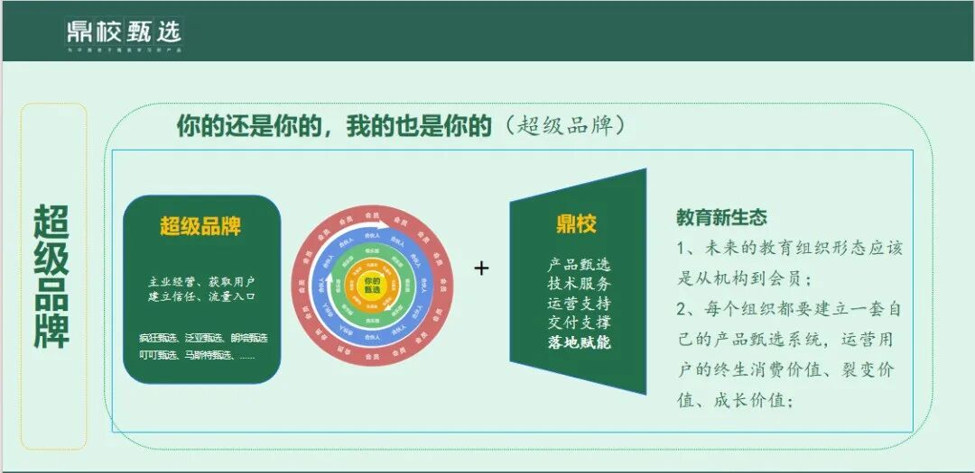 通过创新的商业模式和赋能体系,帮助合伙人实现零风险、高收益的创业目标。通过经营用户需求,打破传统教培机构的局限,鼎校甄选为家长和孩子提供长期的教育解决方案,同时为合伙人创造了可持续的盈利模式。