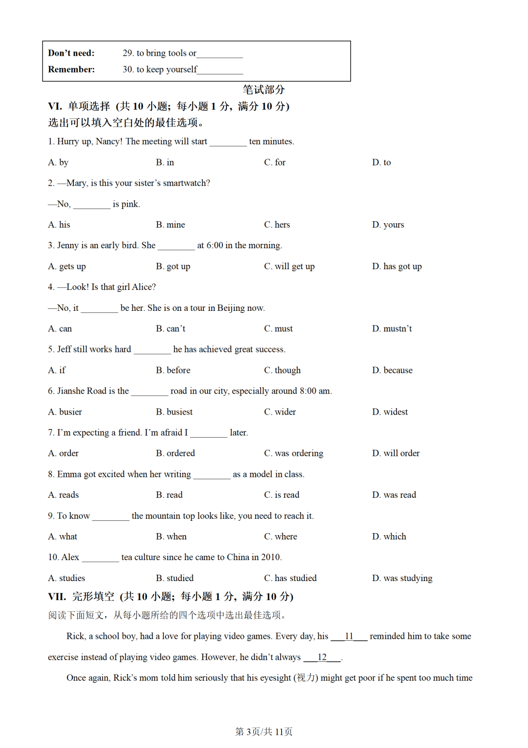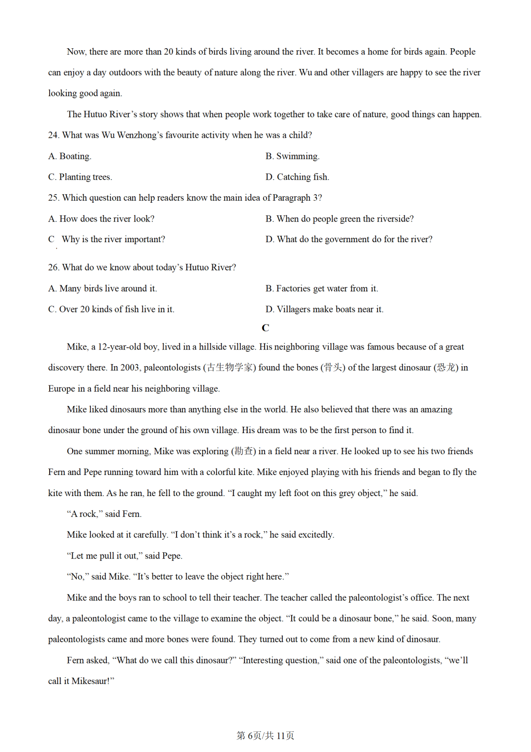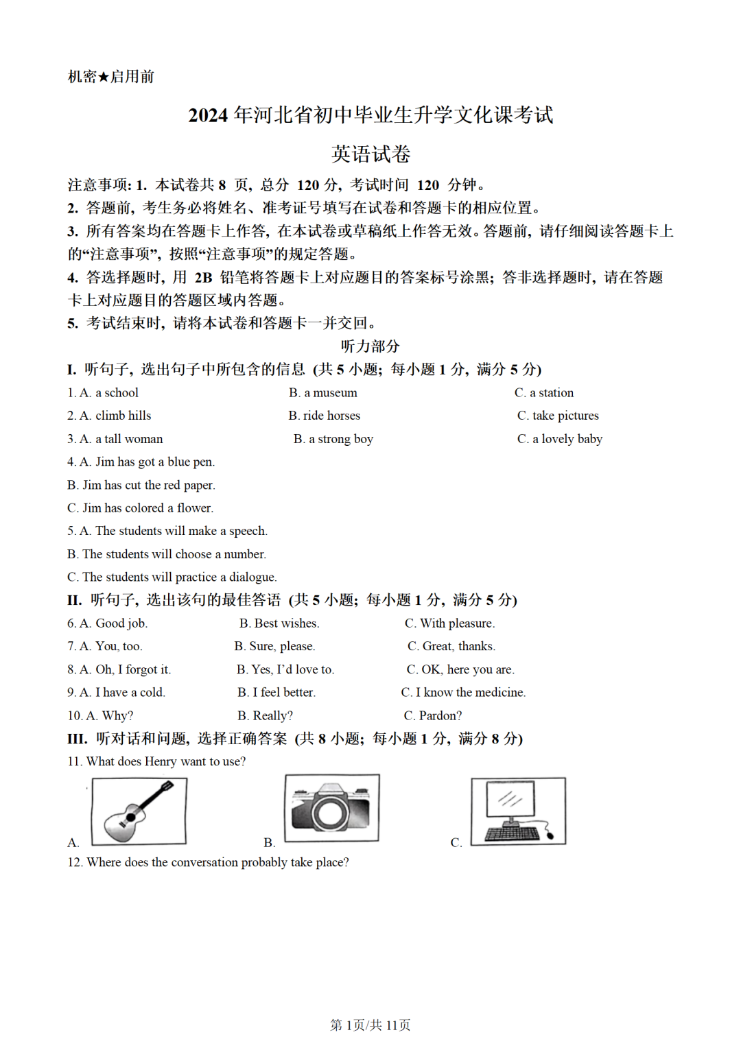 2024年河北省初中毕业生升学文化课考试英语试卷