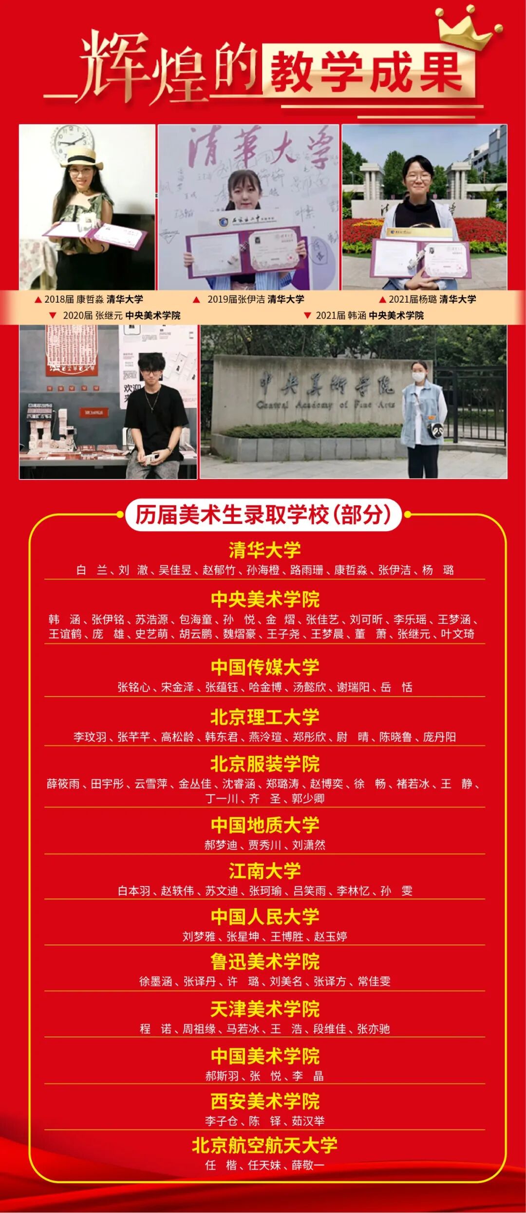 我校是清华大学美术学院首批挂牌的基地学校,拥有一流的美术基础设施和教师队伍,依托优质的文化课教育资源,形成了适合我校美术特长教育的教学管理模式。在历年高考中,我校多名学生被清华大学、中央美术学院,中国美术学院,中国传媒大学等国内一流大学的艺术专业录取。