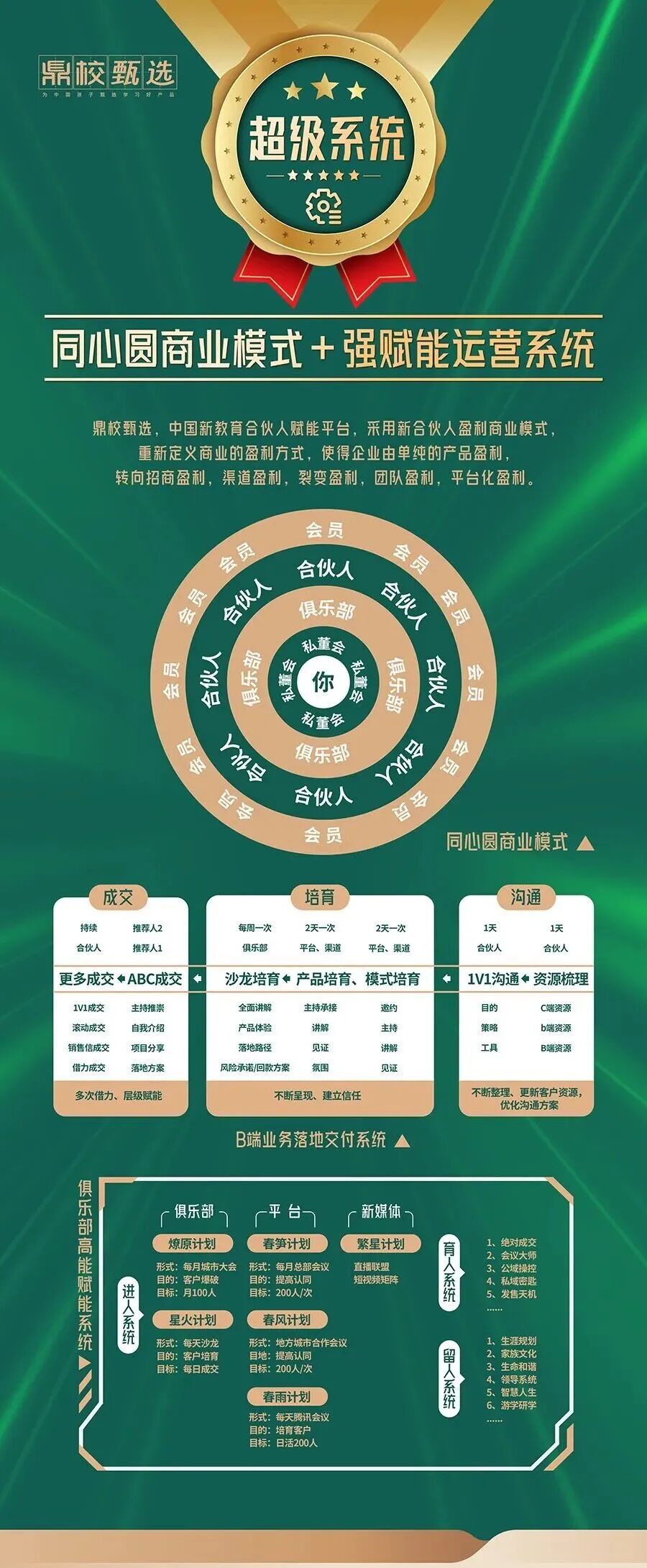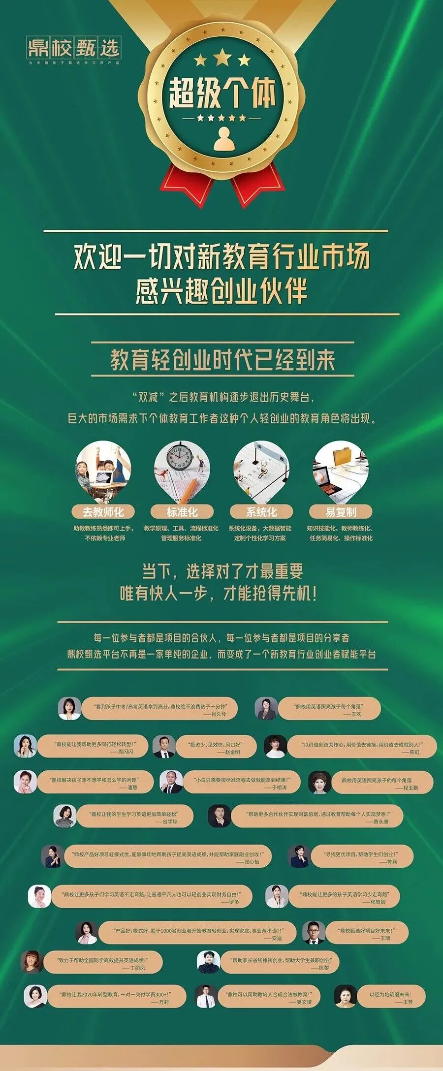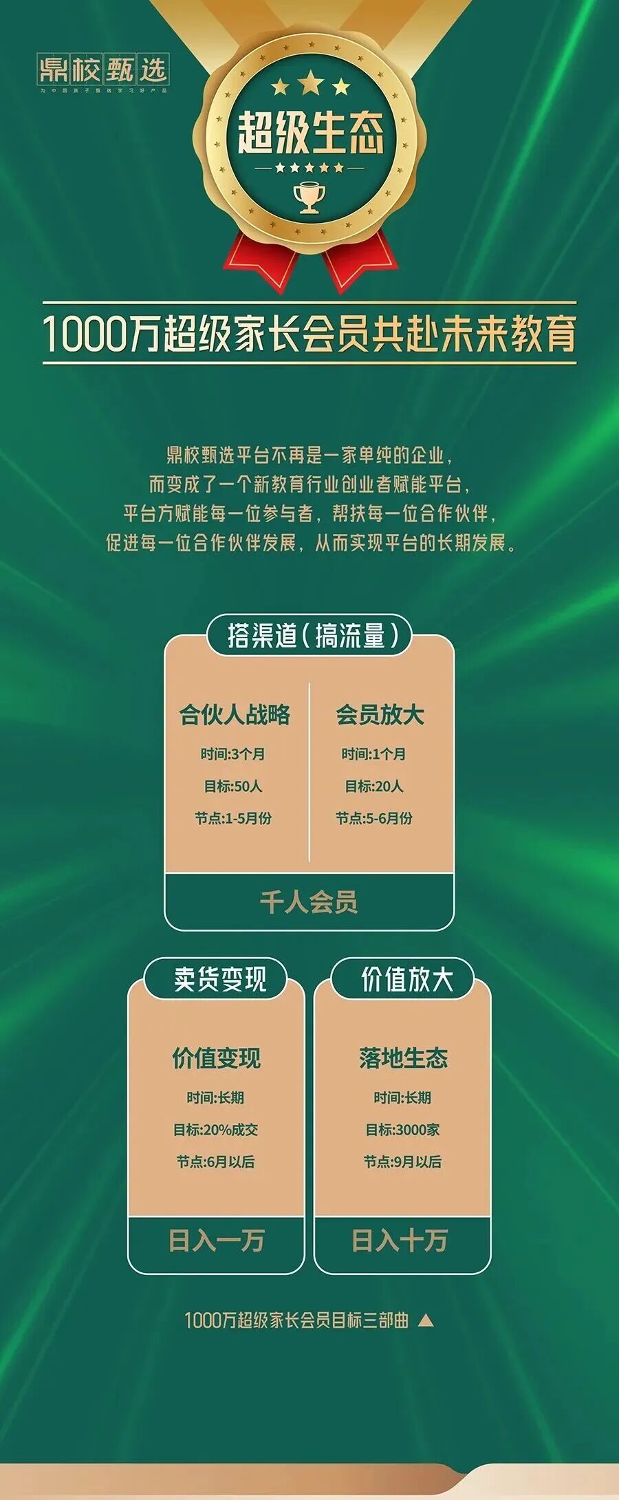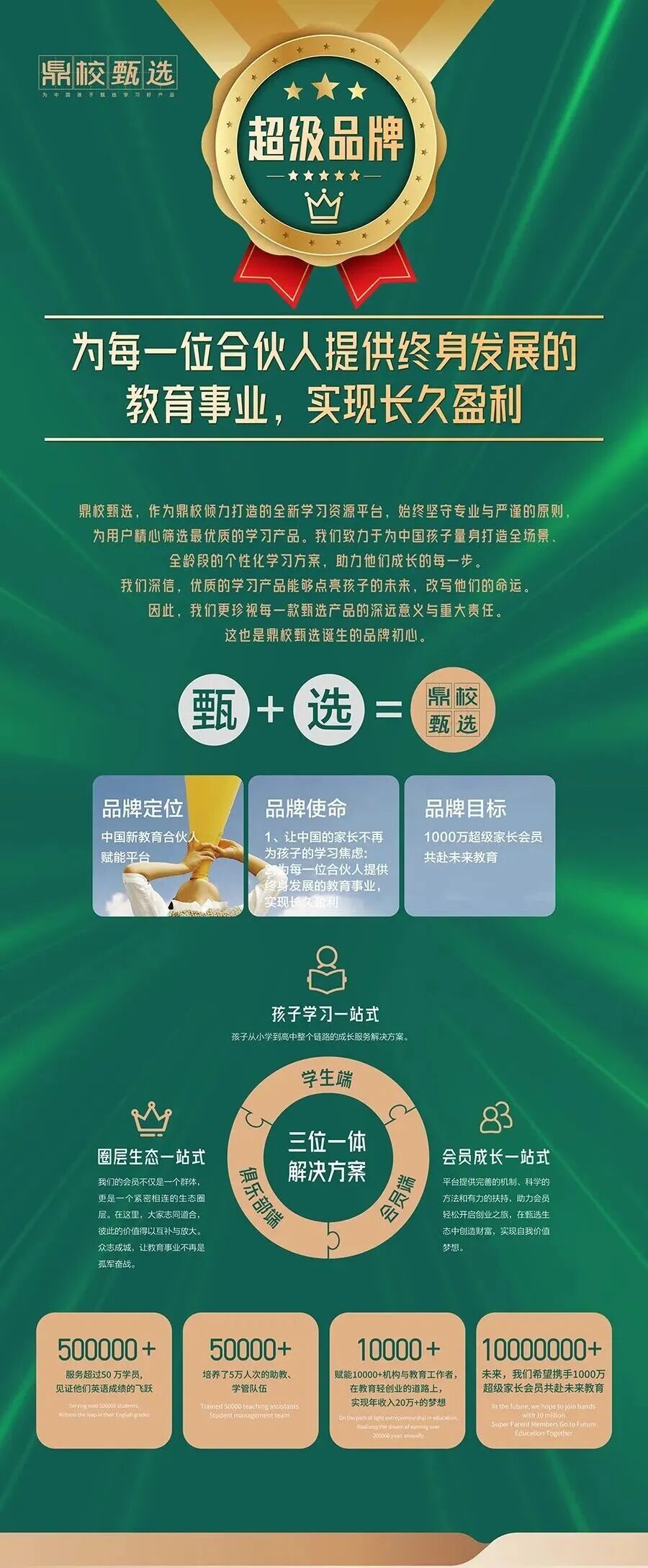 通过创新的商业模式和赋能体系,帮助合伙人实现零风险、高收益的创业目标。通过经营用户需求,打破传统教培机构的局限,鼎校甄选为家长和孩子提供长期的教育解决方案,同时为合伙人创造了可持续的盈利模式。