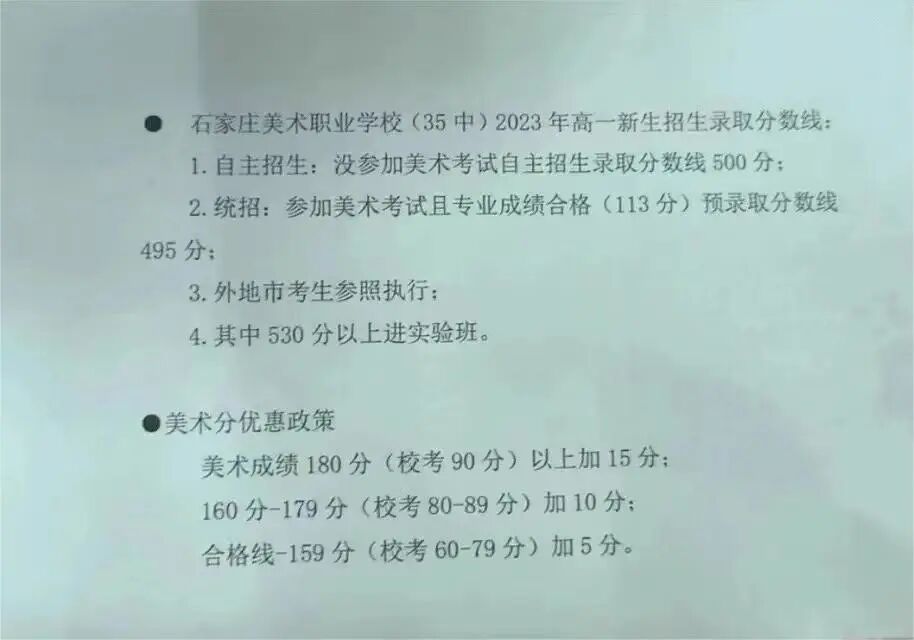 美术专业:中考总分+专业分=660分,免费;中考总分+专业分=640分,半费;中考总分+专业分=590分,全费;中考总分+专业分=560分,可报。