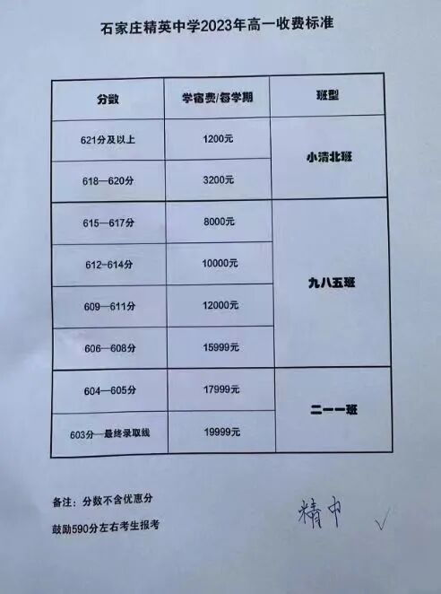 免费、清北班:591分及以上;1/3费、清北班:585分-590分;半费、精英班:575分-584分;2/3费、精英班:565分-574分;全费、重点班:540分-564分;530分以上可报。