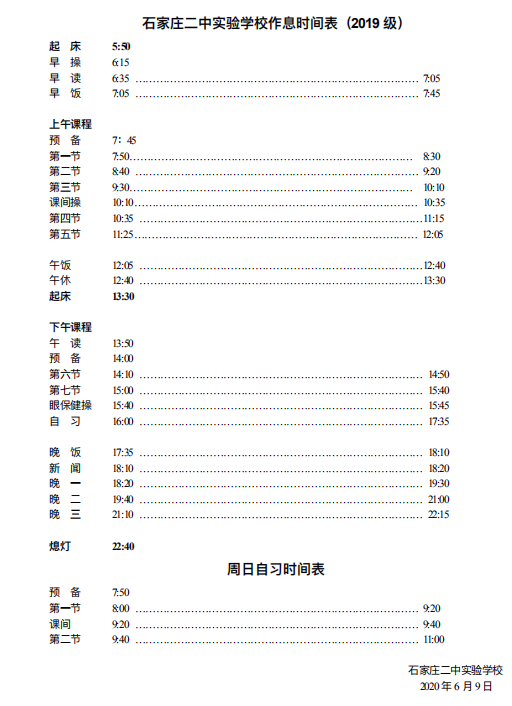 (2)作息:学校周一到周六正常上课,周日上午一般安排自习或者是考试,周日下午学生是自由活动的,社团活动很多安排在周日下午进行。除了周日下午,每周有两节体育课,还有两节体活课(一个小时左右),社团活动基本上也会在这个体活课进行。