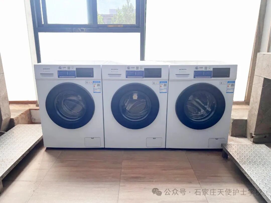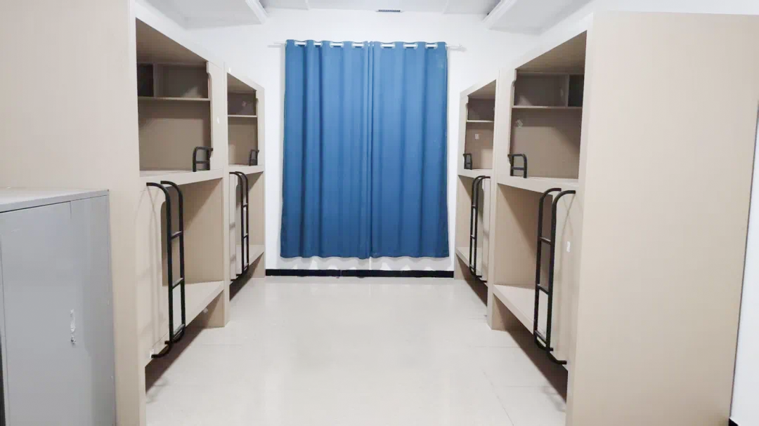 石家庄天使护士学校今年对学生生活环境做了大升级,采用太空舱宿舍,配备新风系统和中央空调,有储物柜、全自动洗衣机,24小时热水提供。整体风格采用简约风,米蓝清新配色,给人舒适放松的感觉。