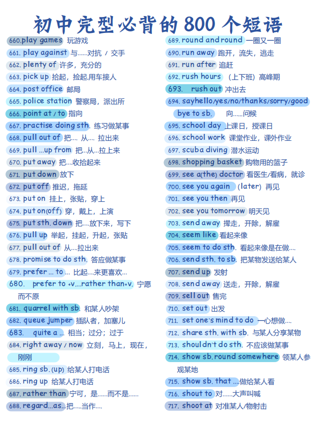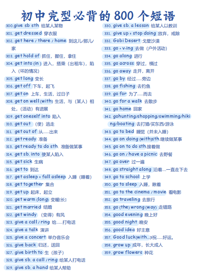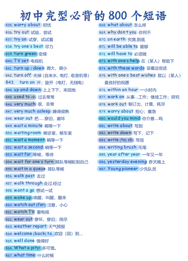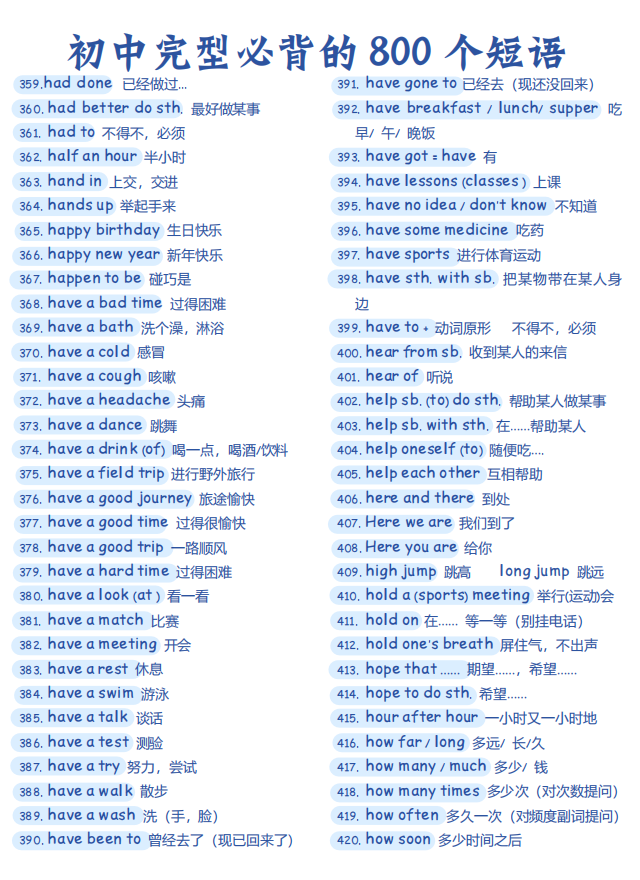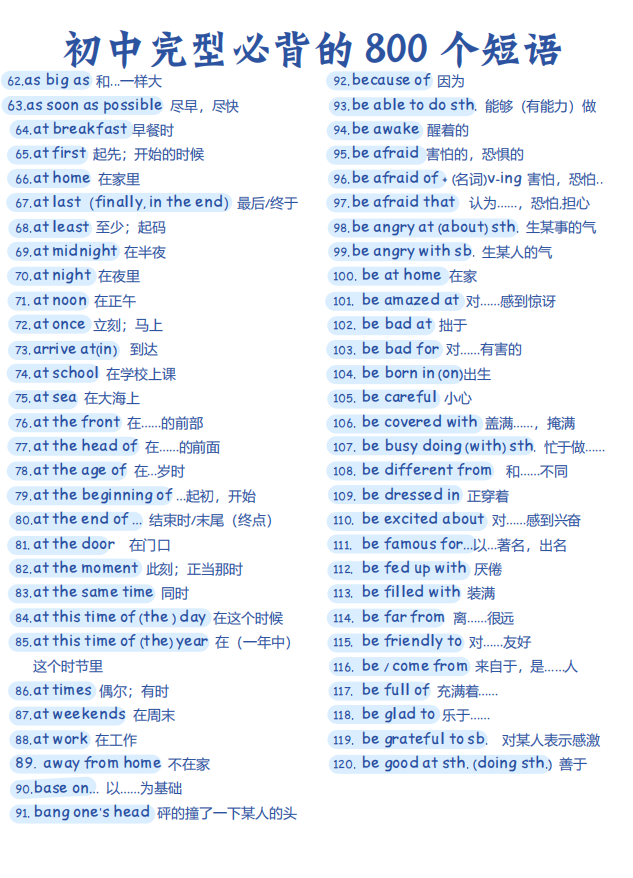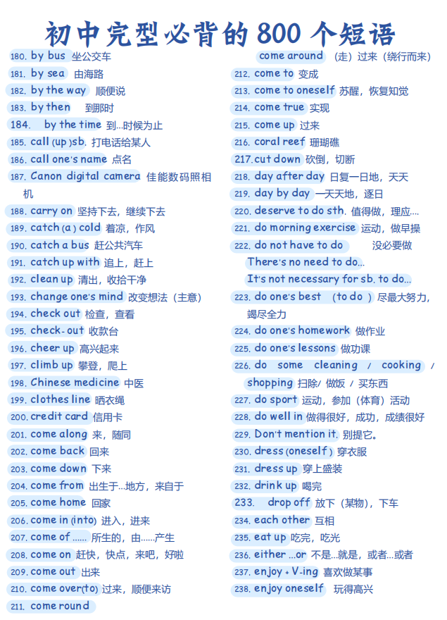 初中英语完型必背的 800个短语【可打印】
